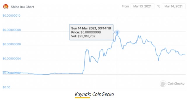 CoinGecko verilerine göre SHIB fiyatı, Musk'ın gönderisinin ardından yüzde 300 artış gösterdi.