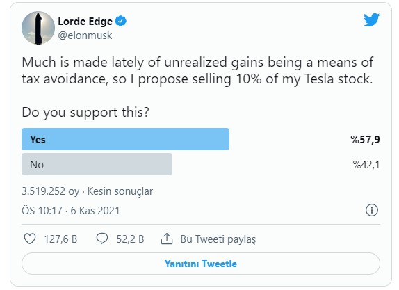 ABD'deki 'milyarderler vergisi' yasa tasarısına tepki gösteren Musk, Twitter'da “Gerçekleşmemiş kazancın vergi kaçırmak olduğuna dair tartışmalar devam ederken sahip olduğum Tesla hisselerinin yüzde 10’unu satayım mı” sorusunu sorarak bir anket başlattı. Musk, sonuç ne olursa olsun uyacağını da açıklamıştı.