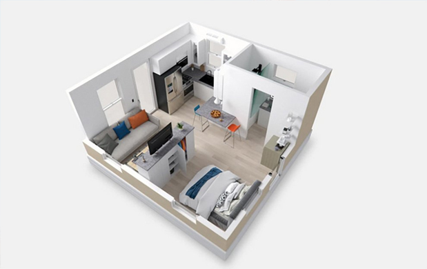 38 metrekarelik modüler ev ‘tiny house’ (küçük ev) konseptiyle tasarlanmış. Boxabl tarafından tasarlanan ev bir yaşam alanı, tuvalet, yatak ve mutfaktan oluşuyor.