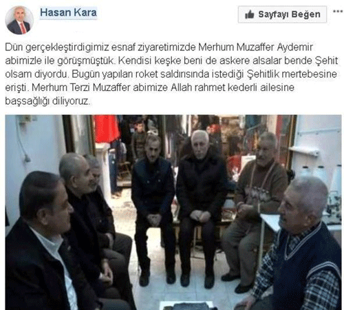 Kara, ziyareti ile ilgili görüntüleri de yayınladığı mesajında, "Dün gerçekleştirdigimiz esnaf ziyaretimizde Merhum Muzaffer Aydemir abimizle ile görüşmüştük. Kendisi keşke beni de askere alsalar bende Şehit olsam diyordu. Bugün yapılan roket saldırısında istediği Şehitlik mertebesine erişti. Merhum Terzi Muzaffer abimize Allah rahmet kederli ailesine başsağlığı diliyoruz" ifadelerini kullandı.
