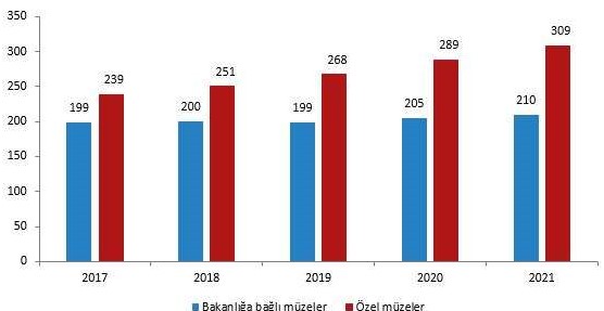 Türkiye İstatistik Kurumu (TÜİK) tarafından yapılan açıklamaya göre, müze sayısı 2021 yılında 2020 yılına göre %5,1 artarak 519 oldu. Müzelerin 210 tanesi Kültür ve Turizm Bakanlığı bünyesinde, 309 tanesi ise özel müze kategorisinde yer aldı. Ören yeri sayısı ise 143 oldu.