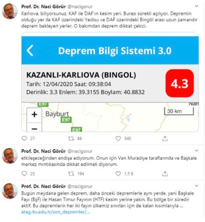 Bilim Akademisi Üyesi Prof. Dr. Naci Görür, Bingöl'de meydana gelen deprem sonrası yaptığı açıklamada, "Karlıova, biliyorsunuz, KAF ile DAF'ın kesim yeri. Burası sürekli açılıyor. Depremin olduğu yer ile KAF üzerindeki Yedisu ve DAF üzerindeki Bingöl arası uzun zamandır deprem bekleyen yerler. O bakımdan deprem dikkat çekici" dedi.
