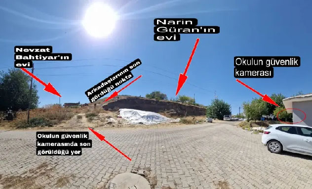 Narin’in en son görüntüsü kaybolduğu 21 Ağustos’ta saat 15.15’te okulun güvenlik kamerasına yansıdı. Jandarma kamerasından Nevzat Bahtiyar’ın aracının dere kenarına geliş saati ise 15.40 olarak belirlendi. Narin’in bu 25 dakikalık zaman diliminde kaybolduğu düşünülüyor. Nevzat Bahtiyar’ın cesedi çuvala koyduğunu söylediği evinin önü ile Narin’in bulunduğu nokta ise araçla 7 dakika. Bir bölümü asfalt, bir bölümü ise toprak olan yaklaşık 2 kilometrelik yolu DHA muhabiri, otomobille 40 kilometre hızla 7 dakikada katetti. 7 dakikalık zamanın yolda harcandığı hesaplandığında, geriye kalan 18 dakikalık süredeki sır perdesi aralanmayı bekliyor.