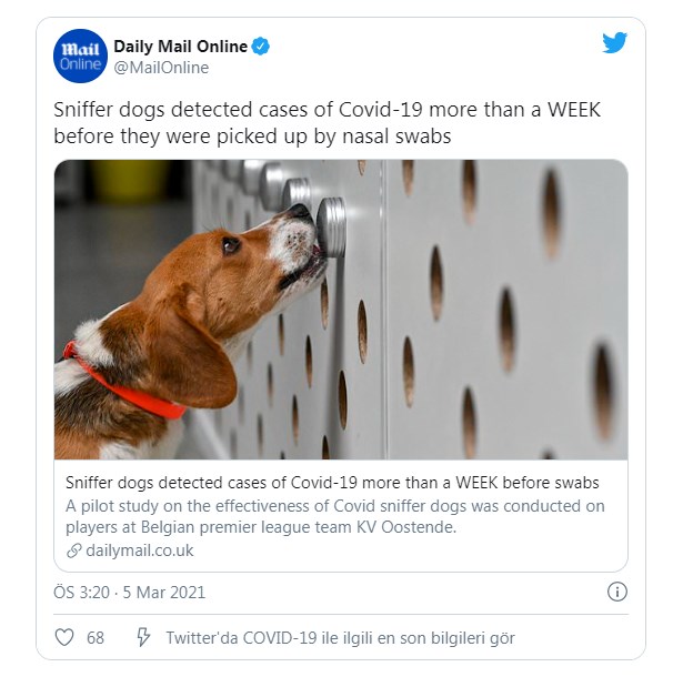 Temmuz 2020'de Almanya'da yapılan artaştırmaya göre, narkotik köpeklerinin koronavirüs tespiti konusunda başarılı olduğu sonucuna ulaşılmıştı.