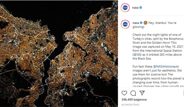 Amerikan Ulusal Havacılık ve Uzay Dairesi (NASA), sosyal medya platformu Instagram üzerinden İstanbul'a ait bir uydu görüntüsü paylaştı. Paylaşımda "Selam İstanbul, parlıyorsun!" notu düşüldü.