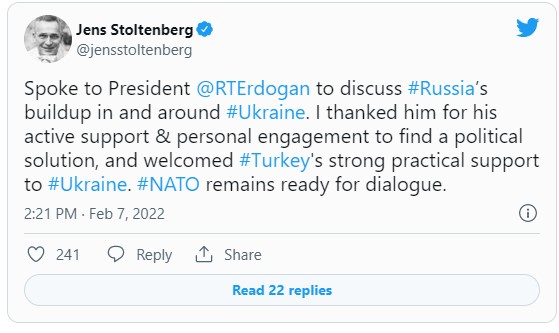 Rusya'nın Ukrayna sınırındaki yığınağını görüştüklerini kaydeden Stoltenberg, "Siyasi çözüm bulunması için aktif desteği ve kişisel çabalarından dolayı kendisine teşekkürlerimi ilettim." ifadesini kullandı.