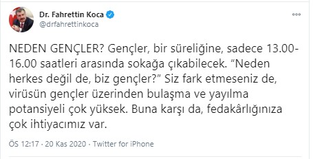 Sağlık Bakanı Fahrettin Koca sosyal medya hesabından, gençlere de getirilen sokağa çıkma kısıtlaması hakkında açıklama yaptı.