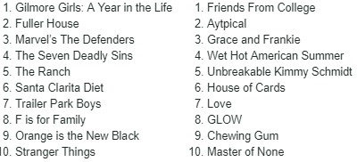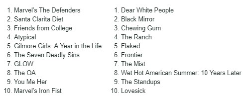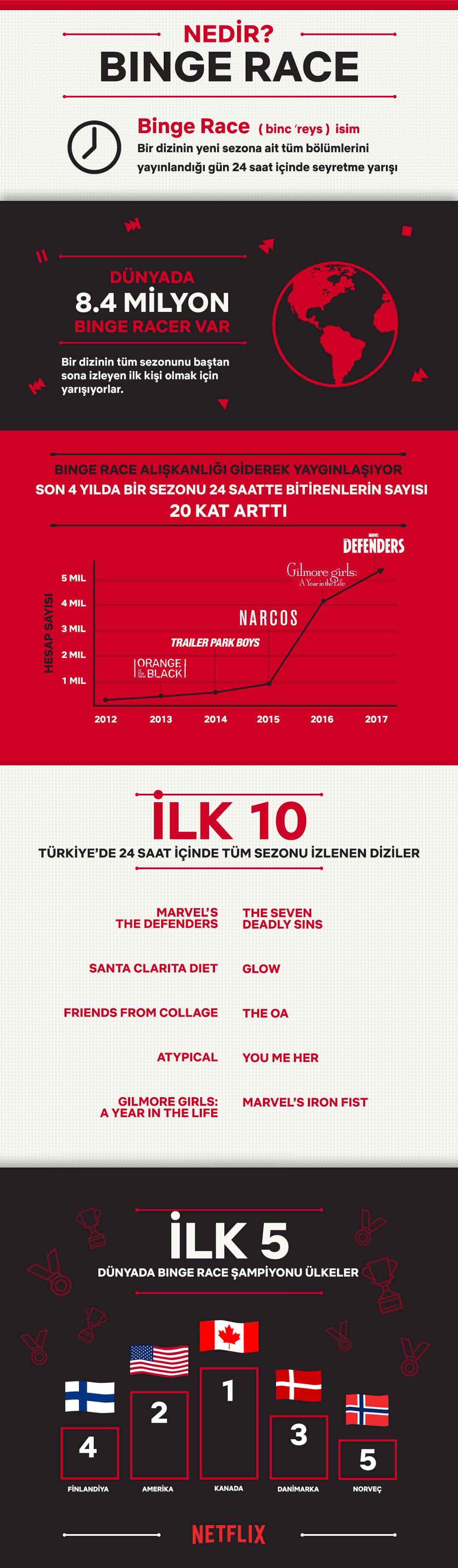 Türkiye’de kullanıcılar tarafından dizi maratonu yarışı halinde en fazla izlenen dizi Marvel's The Defenders oldu. Onu Santa Clarita Diet ve Friends from College gibi diziler takip etti. Türkiye’deki Netflix kullanıcılarının 24 saatlik dizi maratonuyla tüm bölümlerini izledikleri ilk 20 yapımın sıralaması ise şöyle: