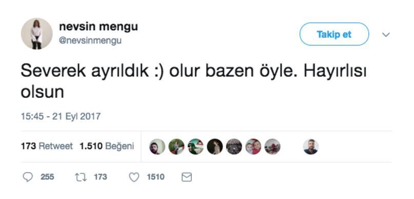 Nevşin Mengü, kişisel Twitter hesabından CNN Türk'te üstlendiği ana haber spikerliği görevinden ayrıldığını duyurdu. Mengü, sosyal medya hesabında yaptığı paylaşımda "Severek ayrıldık. Olur bazen öyle. Hayırlısı olsun", ifadesine yer verdi.