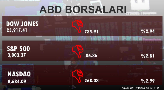 Dow Jones sanayi endeksi günü 785.91 puan ve yüzde 2.94 oranında düşüşle 25,917.41 puanla tamamladı. S&P 500 ise 86.86 puan ve yüzde 2.81 oranında düşüşle gün sonunda 3,003.37 puana geriledi. Nasdaq da, 268.08 puan ve yüzde 2.99 oranında düşerek günü 8,684.09 puanla kapadı.