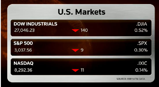 Dow Jones sanayi endeksi günü 140.46 puan ve yüzde 0.52 oranında düşüşle 27,046.23 seviyesinde tamamladı. S&P 500 ise 9.21 puan ve yüzde 0.30 kayıpla gün sonunda 3,037 seviyesine geriledi. Nasdaq da, 11.62 puan ve yüzde 0.14 oranında düşüşle günü 8,292.36 seviyesinde kapadı.