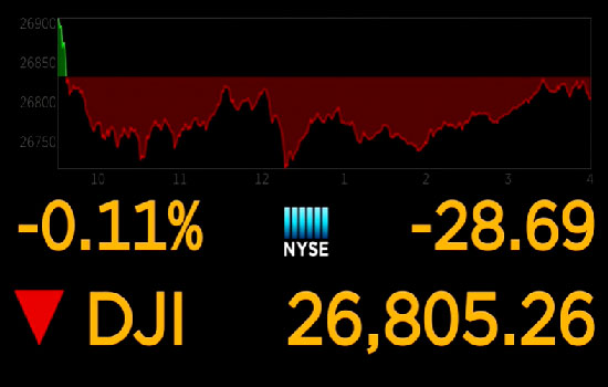 Dow Jones sanayi endeksi günü 28.42 puan ve yüzde 0.11 oranında düşüşle 26,805.53 seviyesinde tamamladı. S & P 500 ise 5.77 puan ve yüzde 0.19 oranında artış ile gün sonunda 3,010.29 seviyesine yükseldi. Nasdaq da 66.00 puan ve yüzde 0.81 oranında artışla günü 8,185.80 seviyesinde tamamladı.