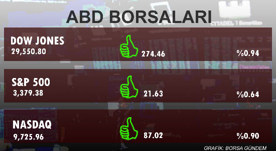ABD borsalarında çarşamba günü 7.40 milyar hisse el değiştirdi. Dow Jones sanayi endeksi günü 274.46 puan ve yüzde 0.94 oranında artışla 29,550.80 seviyesinde tamamladı ve 6 Şubat'tan sonra kapanış rekoru kırdı. S&P 500 de 21.63 puan ve yüzde 0.64 oranında yükselerek gün sonunda 3,379.38 seviyesine ulaştı. Nasdaq ise 87.02 puan ve yüzde 0.90 oranında yükselişle 9,725.96 seviyesinde günü kapadı.