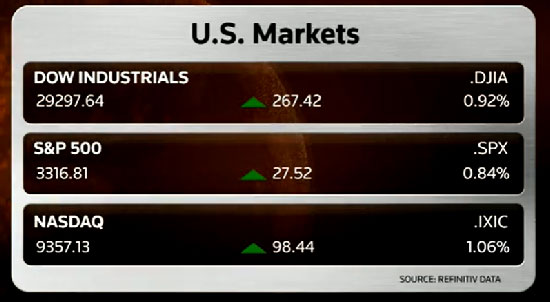 Dow günü 267.42 puan ve yüzde 0.92 oranında artışla 29,297.64 puanla tamamladı. S&P 500 de 27.52 puan ve yüzde 0.84 oranında artışla günü 3,316.81 seviyesinde tamamladı Nasdaq ise yeni rekora günün oransal olarak en fazla yükselen endeksi oldu. Nasdaq 98.44 puan ve yüzde 1.06 oranında yükselişle günü 9,357.13 puanla tamamladı.