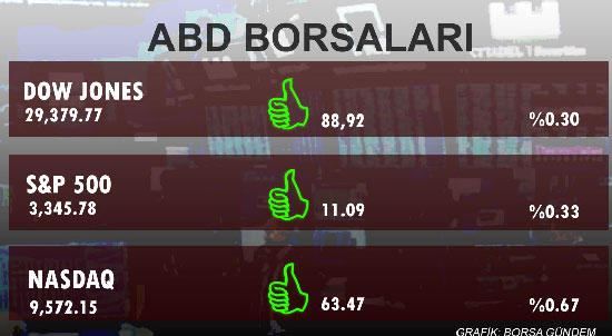 ABD borsalarında perşembe günü 7.3 milyar hisse el değiştirdi. Dow Jones sanayi endeksi günü 88.92 puan ve yüzde 0.30 oranında artışla 29,379.77 seviyesinde tamamladı. S&P 500 ise 11.09 puan ve yüzde 0.33 oranında artışla gün sonunda 3,345.78 seviyesine yükseldi. Nasdaq da, 63.47 puan ve yüzde 0.67 oranında yükselişle günü 9,572.15 puanla kapadı.