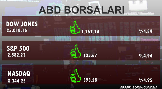 15.81 milyar hissenin el değiştirdiği salı günü Dow Jones sanayi vendeksi 1.167.14 puan ve yüzde 4.89 oranında yükselerek 25.018.16 puana ulaştı. S&P 500 ise 135.67 puan ve yüzde 4.94 oranında yükselerek gün sonunda 2.882.23 seviyesine ulaştı. Nasdaq da, 393.58 puan ve yüzde 4.95 oranında yükselişle günü 8.344.25 seviyesinde tamamladı.