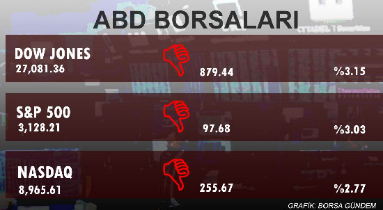 Dow Jones sanayi endeksi günü 879.44 27 ve yüzde 3.15 oranında düşüşle 27,081.36 seviyeside kapadı. S&P 500 de 97.68 puan ve yüzde 3.03 oranında düşüşle gün sonunda 3,128.21 seviyesine geriledi. Nasdaq ise 255.67 puan ve yüzde 2.77 oranında düşüşle günü 8.965.61 seviyesinde tamamladı.