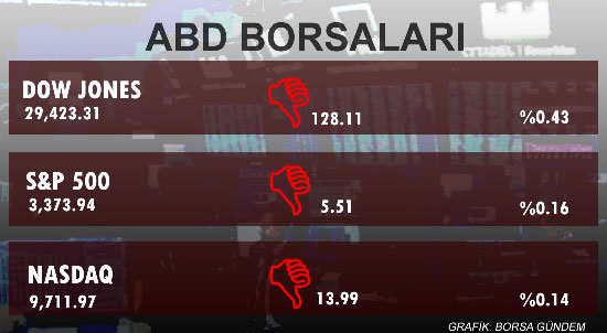 ABD borsalarında perşembe günü 6.86 milyar hisse el değiştirdi. Dow Jones sanayi endeksi günü 128.11 puan ve yüzde 0.43 oranında düşüşle 29,423.31 seviyesinde tamamladı. S&P 500 de, 5.51 puan ve yüzde 0.16 oranında kayıpla gün sonunda 3,373.94 seviyesine geriledi. Nasdaq ise 13.99 puan ve yüzde 0.14 oranında düşerek günü 9,711.97 seviyesinde kapadı.