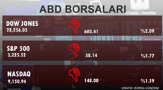 Yaklaşık 9.03 milyar hissenin el değiştirdiği yoğun satıcılı günde Dow Jones sanayi endeksi 603.41 puan ve yüzde 2.09 oranında düşerek 28,256.03 puana geriledi. S&P 500 58.14 puan ve yüzde 1.77 oranında kayıpla gün sonunda 3,225.52 seviyesine indi. Nasdaq da 148 puan ve yüzde 1.59 oranında kayıpla günü 9,150.94 seviyesinde tamamladı.