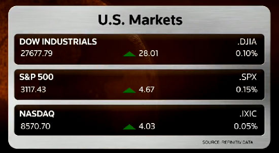 Dow Jones sanayi endeksi günü 28.01 puan ve yüzde 0.10 oranında yükselişle 27,677.79 seviyesinde tamamladı. S&P 500 de 4.67 puan ve yüzde 0.15 oranında artışla gün sonunda 3,117.43 4.67 seviyesine yükseldi. Nasdaq ise 4.03 puan ve yüzde 0.05 oranında bir yükselişle günü 8,570.70 seviyesinde kapadı.