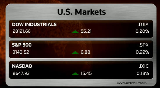 Dow Jones sanayi endeksi günü 55.21 puan ve yüzde 0.20 oranında artışla 28,121.68 seviyesinde tamamladı. S&P 500 de 6.88 puan ve yüzde 0.22 oranında artışla gün sonunda 3,140.52 seviyesine yükseldi. Nasdaq da, 15.45 puan ve yüzde 0.18 oranında yükselişle günü 8,647.93 seviyesinde kapadı.