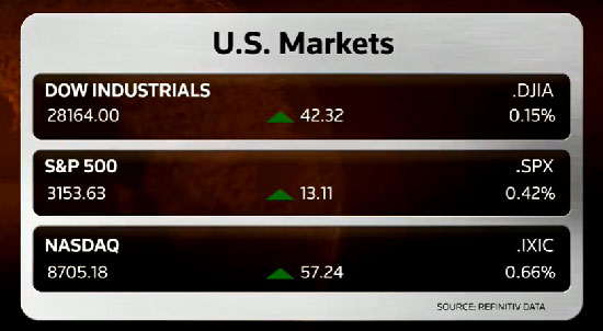 Dow Jones sanayi endeksi günü 42.32 puan ve yüzde 0.15 oranında artışla 28,164.00 seviyesinde tamamladı. S&P 500 ise 13.13 puan ve yüzde 0.42 artışla gün sonunda 3,153.65 seviyesine yükseldi. Nasdaq da 57.24 puan ve yüzde 0.66 oranında artışla günü 8,705.18 seviyesinde kapadı.