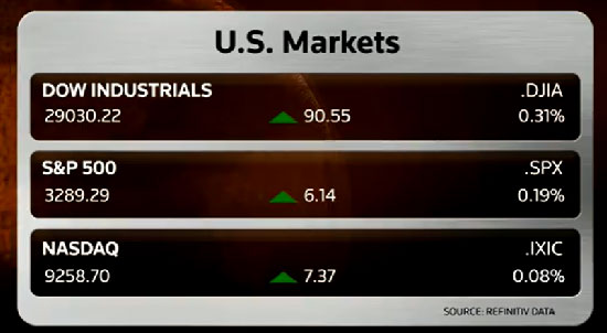 Dow Jones sanayi endeksi günü 90.55 puan ve yüzde 0.31 oranında artışla 29,030.22 puanla tamamladı. S&P 500 de 6.14 puan ve yüzde 0.19 oranında artışla gün sonunda 3,289.29 puana yükseldi. Nasdaq ise 7.37 puan ve yüzde 0.08 oranında artışla günü 9,258.70 seviyesinde kapadı.