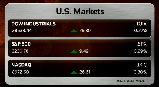 Dow Jones sanayi endeksi günü 76.30 puan ve yüzde 0.27 oranında yükselişle 28,538.44 seviyesinde tamamladı. S&P 500 ise 9.43 puan ve yüzde 0.29 oranında artışla gün sonunad 3,230.78 seviyesine yükseldi. Nasdaq da 26.61 puan ve yüzde 0.30 oranında yükselerek günü 8,972.60 seviyesinde kapadı.