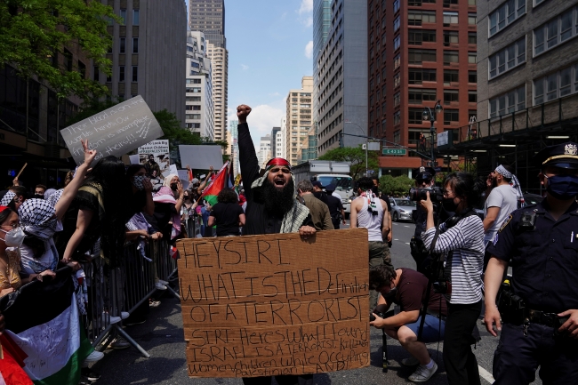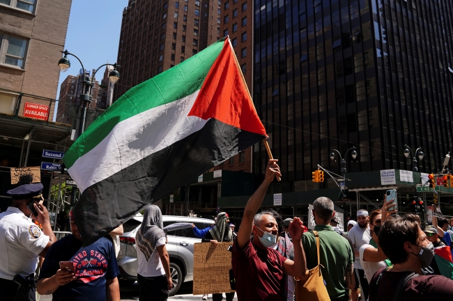 Manhattan 2. Cadde'deki Başkonsolosluk binası önünde toplanan göstericiler, özgür Filistin çağrısı yapan ve işgal altındaki Doğu Kudüs ve Gazze'de devam eden İsrail saldırılarının sona erdirilmesine yönelik pankartlar taşırken, New York polisi (NYPD) İsrail Başkonsolosluğu'nun çevresinde geniş güvenlik önlemleri aldı.