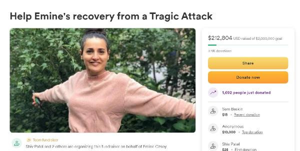 Bağış kampanyasında Emine için “Doktorlar başlangıçta bize, boynunun altındaki hareketi iyileştirme şansının çok düşük olduğunu bildirdi. Sadece bir gün içinde, kollarını hareket ettirerek bu tahmine meydan okudu. Bu çok büyük bir adım ama iyileşme yolu uzun ve zorlu olacak. O bir savaşçı ve şimdiden iyileşmek için savaşıyor. İyileşecek ama herkesin yardımına ihtiyacı var. Tıbbi masrafları şimdiden altı rakamlı sayılara ulaştı ve herhangi bir bağış, açık yürekle minnetle kabul edilecektir” denildi.