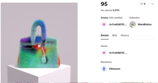 Los Angeles’ta yaşayan sanatçı Mason Rothschild, “MetaBirkins” adını verdiği sanat eserleri yaratıyor ve bunları web sitesinde NFT olarak satıyor. Sanatçının böyle bir resmi Aralık ayında 42.000 dolara sattığı söyleniyor.