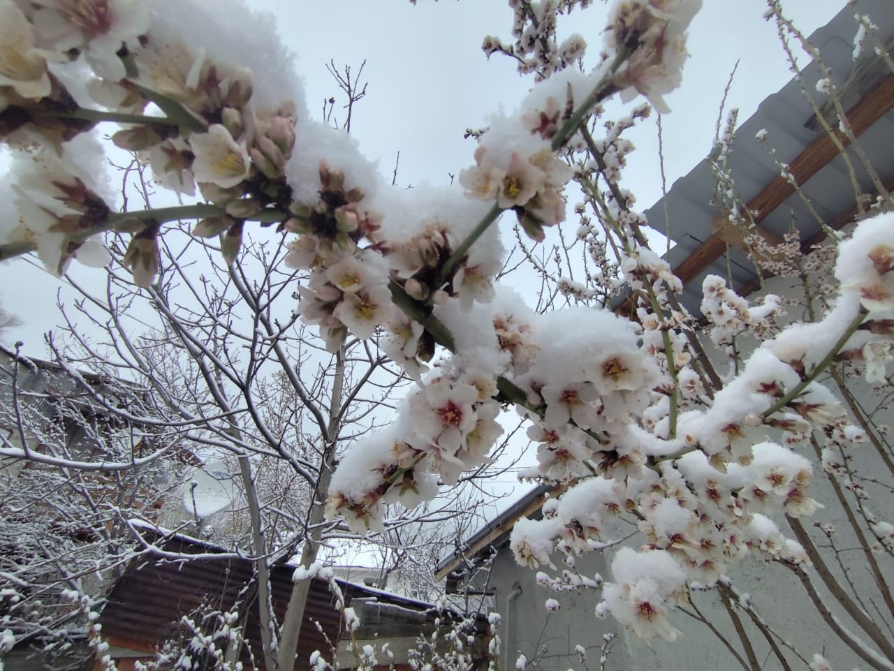 Baharın gelişiyle çiçek açan meyve ağaçlarının üzerine kar düşmesi, bölgede seyirlik görüntüler oluşturdu. Beyaz örtü ile ağaçlardaki çiçeklerin oluşturduğu manzara, doğaseverlerin ilgisini çekti.