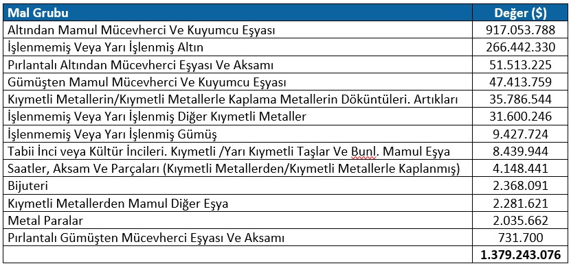 Ürün gruplarına bakıldığında 2021 yılının 4 ayında en çok ihraç edilen ürün 917 milyon dolarla “Altından Mamul Mücevherci ve Kuyumcu Eşyası” oldu. Bu grubu 266,4 milyon dolarla “İşlenmemiş Veya Yarı İşlenmiş Altın” takip ediyor. Dört ayda ihraç edilen ürün grupları şöyle sıralandı: