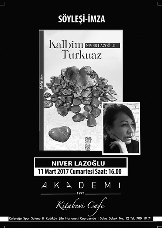 Türk Edebiyatına yeni bir soluk getiren Niver Lazoğlu’nun çok konuşulan romanı ‘Kalbim Turkuaz’ın imza gününde renkli anlar yaşandı. Pangaltı’da Nostalji Kitabevi’ndeki söyleşiye ilgi yoğundu. Kitabın yazarını soru yağmuruna tutan okurlar, yorumlarını da dile getirdi. Çok samimi havada geçen buluşmada ‘Kalbim Turkuaz’a büyük tat veren şivesi sohbete adeta damgasını vurdu.
