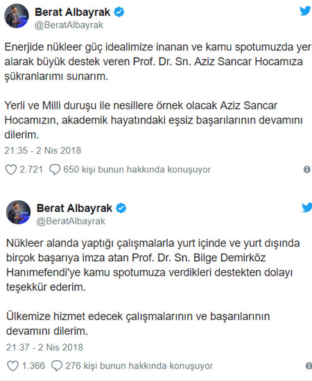 Enerji ve Tabii Kaynaklar Bakanı Berat Albayrak, attı tweetlerle iki bilim insanına destekleri için teşekkür etti.