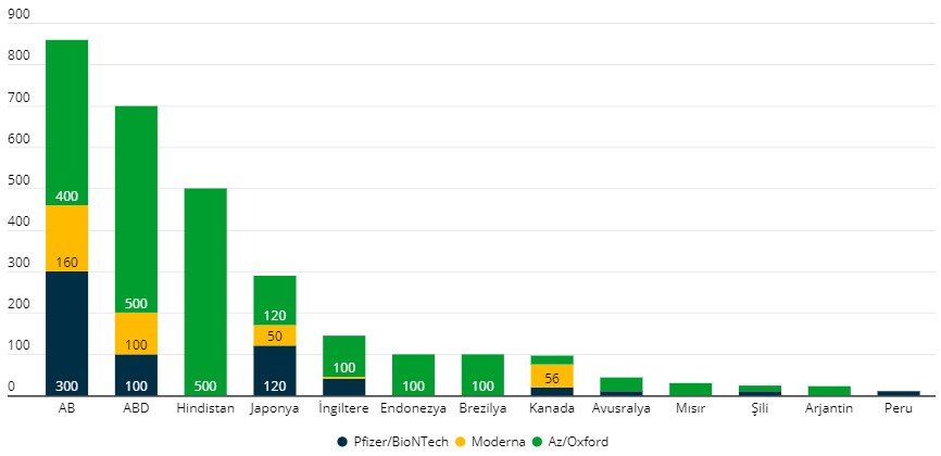 AB, toplamda 860 milyon doz aşı siparişi verdi. Bu rakam Japonya'da 290 milyon ; İngiltere'de, 145 milyon; Kanada'da 96 milyon, Avustralya 43.8 milyon, Şili'de 24.4 milyon.