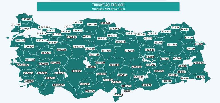 İstanbul'da birinci doz aşı sayısı 3 milyon 512 bin 481, ikinci doz aşı sayısı 2 milyon 236 bin 933, toplamda 5 milyon 749 bin 414, Ankara'da birinci doz aşı sayısı 1 milyon 702 bin 674, ikinci doz aşı sayısı 1 milyon 150 bin 77, toplamda 2 milyon 852 bin 751, İzmir'de ise birinci doz aşı sayısı 1 milyon 358 bin 599, ikinci doz aşı sayısı 939 bin 978, toplamda 2 milyon 298 bin 577 doz olarak kayıtlara geçti.