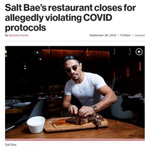 Tuz serpme hareketi ile hem dünya çapında ünlenen, hem de Instagram'da fenomen olarak pek çok ülkede mekan açan Nusret Gökçe'nin Amerika Birleşik Devletleri'nin Boston kentinde yeni açtığı restoranı Kovid-19 protokollerini ihlal ettiği gerekçesiyle kapatıldı. Restoranın kapatılması, New York Post gazetesinin sayfalarına da taşındı.