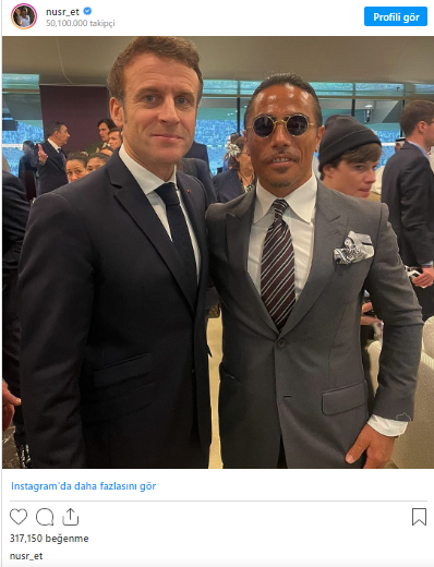 Salt bae' adlı hareketiyle dünya çapında ün kazanan şef Nusret Gökçe, Arjantin'in Dünya Kupası zaferini sahaya inerek kutlamasıyla gündeme gelmişti. Maçın kahramanı Messi ile de yan yana gelen ve futbolcularla birlikte kupayı kaldırdığı anları sosyal medyada paylaşan Gökçe, şimdi de ünlü Fransız lider ile bir araya geldi.