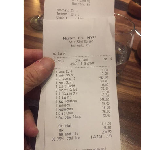 Business Insider yazarı Ronn Torossian Nusr-Et'e giderek deneyimlerini ve gelen hesabı paylaştı. Torossian, bahşiş olarak 200 dolar (750 Türk lirası) istenmesini eleştirdi. Hesapta ayrıca et spagetti için 70 dolar, Nusret salatası için 25 dolar, bir şaşlık için 70 dolar yazıldığı görüldü.