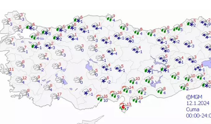 KUVVETLİ YAĞIŞ UYARISI: Rize ve Artvin kıyıları ile İskenderun Körfezi çevrelerinde kuvvetli yağmur; Hakkari ve Bitlis ile Muş ve Van'ın güney, Rize ve Artvin'in iç ve yüksek kesimlerinde yer yer yoğun kar şeklinde görülmesi beklendiğinden, yaşanabilecek ulaşımda aksamalar, su baskını buzlanma ve don gibi olumsuzluklara karşı dikkatli ve tedbirli olunmalıdır.