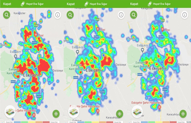 Sağlık Bakanlığı'nın Hayat Eve Sığar (HES) uygulamasındaki risk haritasında Eskişehir’in tamamına yakını ‘çok yüksek risk’ anlamına gelen kırmızıyla kaplıyken, son 10 günde görülen vaka düşüşünün ardından büyük bir kısmı yeşile döndü.