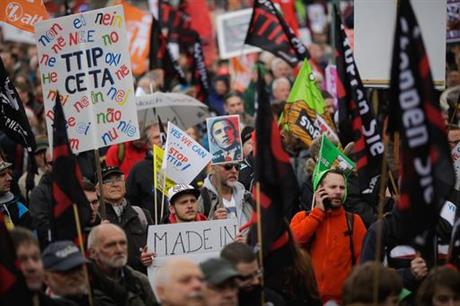 Opera Meydanı’nda toplandıktan sonra kent merkezinde yürüyüşe geçen göstericiler, attıkları sloganlarla, AB ile ABD arasında müzakereleri süren Transatlantik Ticaret ve Yatırım Ortaklığı Anlaşması (TTIP) ve AB ile Kanada arasında planlanan Kapsamlı Ekonomik ve Ticaret Anlaşması’nı (CETA) protesto etti.