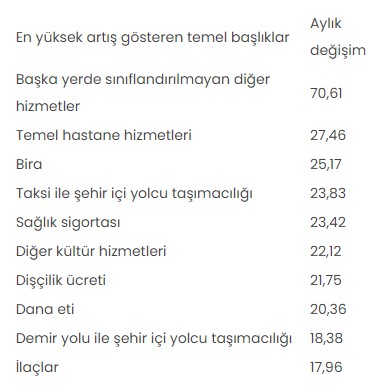 Türkiye İstatistik Kurumu (TÜİK) verilerine göre, geçen ay başka yerde sınıflandırılmayan diğer hizmetlerdeki artışı, yüzde 27,46 ile temel hastane hizmetleri, yüzde 25,17 ile bira, yüzde 23,83 ile taksi ile şehir içi yolcu taşımacılığındaki artış izledi.