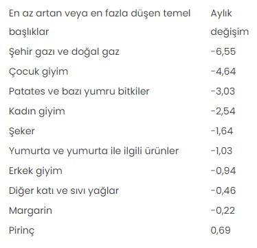 Geçen ay fiyatı en az artan veya en fazla düşen seçilmiş ürünler ile bir önceki aya göre değişim oranları ise şöyle: