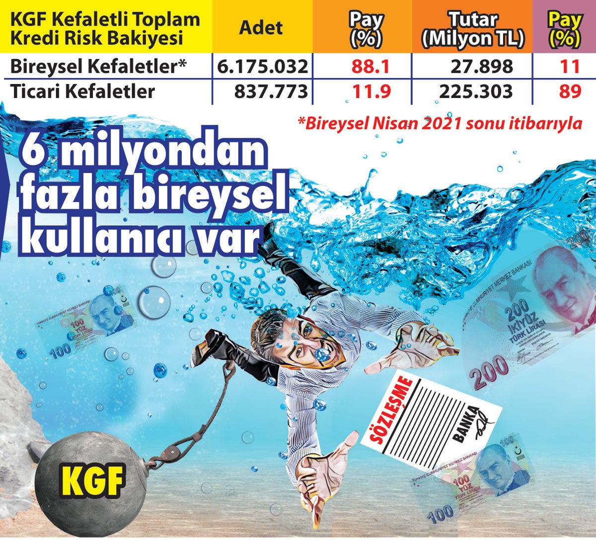 Geçen yılın nisan ayında KGF kapsamında bireysel krediye başvuran kişi sayısı 3 milyon 662 bin 989'du. Kullandırılan kredi miktarı ise 21 milyar TL'yi aştı. 13 Ağustos 2021 itibarıyla ise bu rakam 27 milyar 898 milyon liraya yükselirken, verilen kredi adedindeki artış dikkat çekti. Son 16 ayda bireysel KGF kredi adedi 6 milyon 175 bin 32 oldu. Bu artışta, özellikle kamu bankalarının başvuru yapanların çoğuna şartlara bakmadan kredi vermesi etkili oldu.