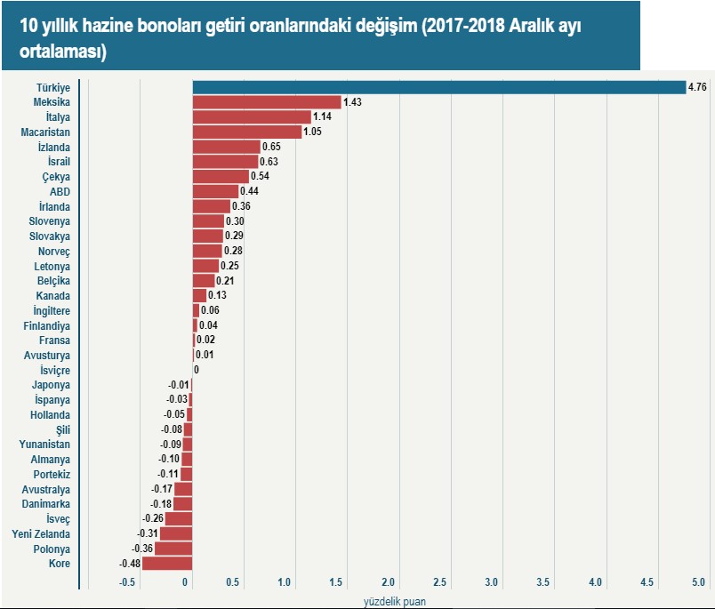 OECD’nin üye ülkelerde devletlerin borçlanmalarıyla ilgili genel görünüm raporuna göre 10 yıllık hazine bonolarındaki borçlanmada faiz artışı açısından geçen yıl Türkiye ilk sırada yer aldı.