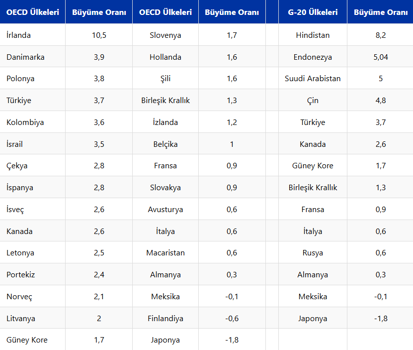 Yüzde 10,5 büyüyen İrlanda ve yüzde 3,9 büyüyen Danimarka, OECD ülkeleri arasında ilk iki sırada yer aldı.