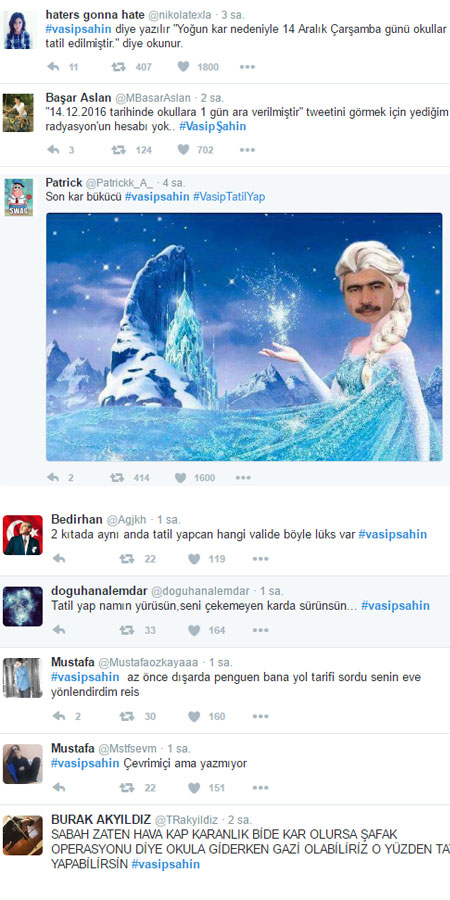 "#vasipsahin diye yazılır tatil diye okunur"," #vasipsahin diye yazılır 'yoğun kar nedeniyle 14 Aralık Çarşamba günü okullar tatil edilmiştir' diye okunur",