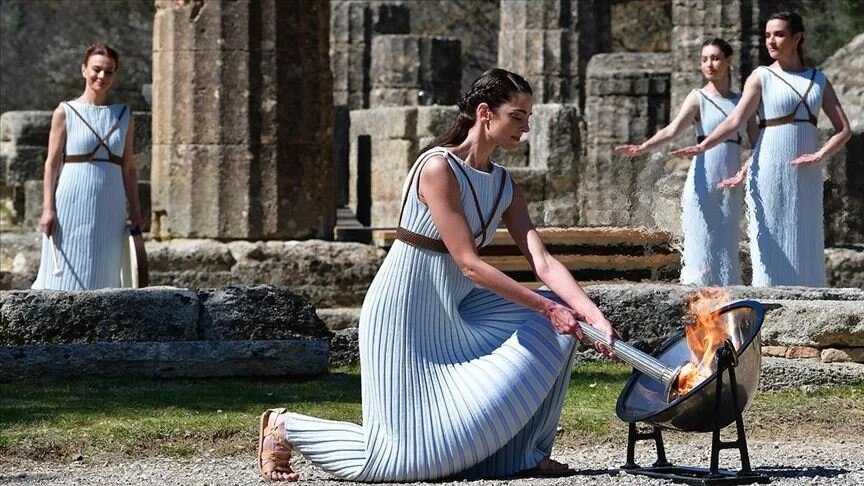 Paris 2024 Olimpiyat Oyunları'nın olimpiyat meşalesi, antik olimpiyat oyunlarının doğduğu yer olan Olimpia antik kentinde düzenlenen özel bir törenle yakıldı.